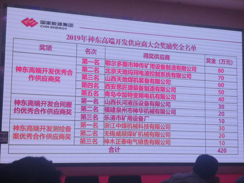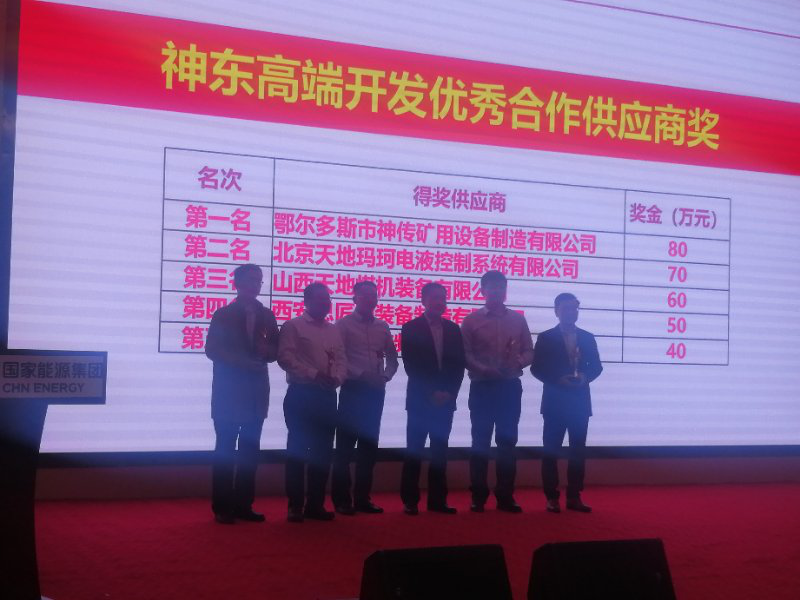 2019年4月18日,神東公司組織召開了2019年高端開發(fā)供應商大會,神東公司相關領導及45家供應商代表共100余人參加了此次會議,神傳公司總經(jīng)理吳建秋先生作為供應商代表出席了本次會議。會上,神東公司副總經(jīng)理王存飛指出,高端開發(fā)工作緊扣我國能源發(fā)展趨勢,具有培育煤機裝備制造的民族品牌、振興民族工業(yè)的重要意義。當日下午,神東公司對11家高端開發(fā)合作供應商進行了表彰。 鄂爾多斯市神傳礦用設備制造有限公司(以下簡稱神傳公司)憑借優(yōu)異的履約率及較高的綜合評價,從眾多供應商中脫穎而出,獲得神東公司授予的“2019年神東高端開發(fā)優(yōu)秀合作供應商獎第一名”的榮譽以及80萬元重金獎勵!